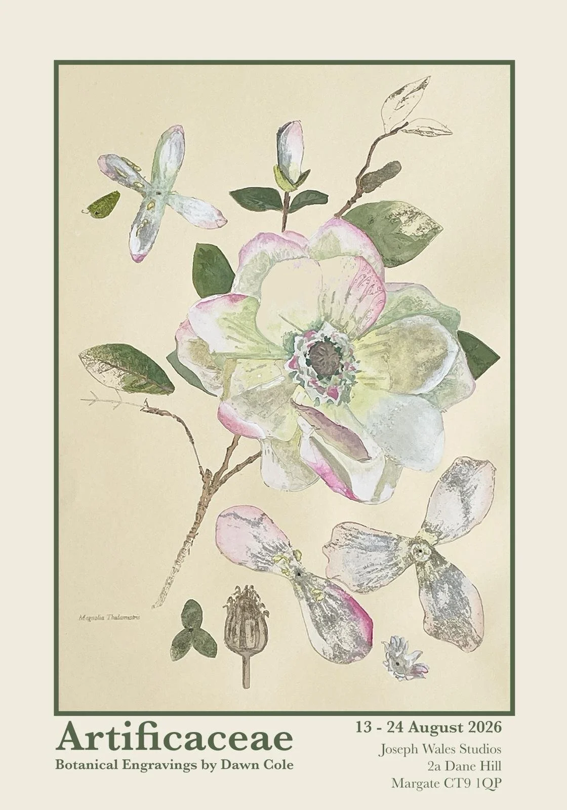 An exhibition of Botanical Engravings by Dawn Cole, dissecting artificial flowers and their meaning.