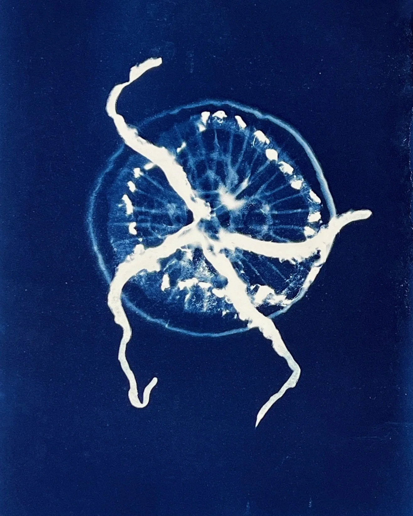 Elizabeth Walker is a multidisciplinary artist, born in Michigan and based in Margate, working with photography, mixed-media and found materials. Her practice often centres on overlooked natural forms and fleeting phenomena. In this exhibition, she presents cyanotypes of jellyfish, capturing both the fragility and quiet resilience of marine life.
